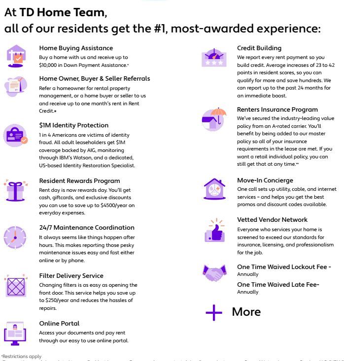 -Resident Benefit Package: All TD Home Team's Residents have the option to be enrolled in the Resident Benefits Package (RBP) for $44/month which includes: