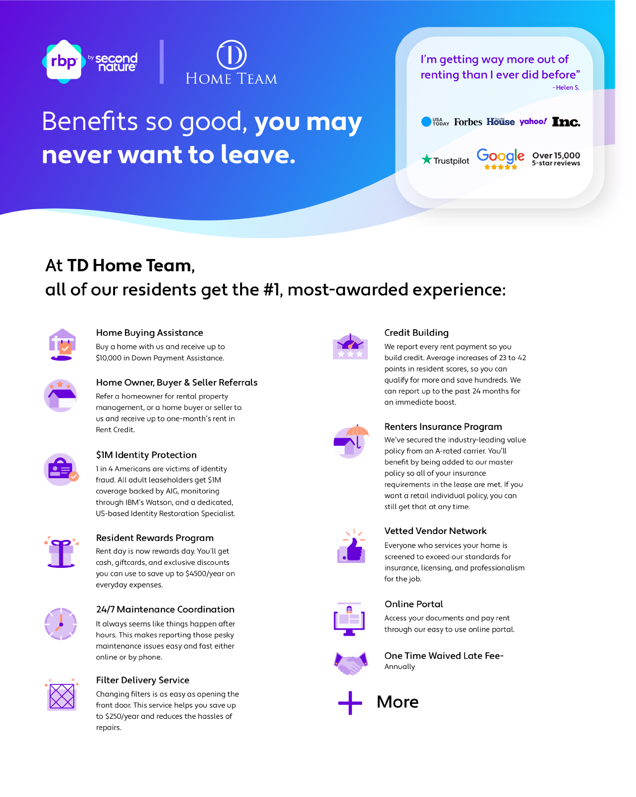 -Resident Benefit Package: All TD Home Team's Residents have the option to be enrolled in the Resident Benefits Package (RBP) for $44/month which includes: